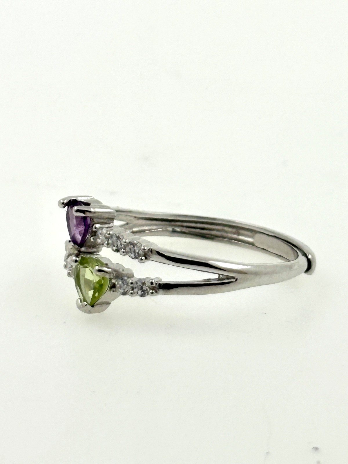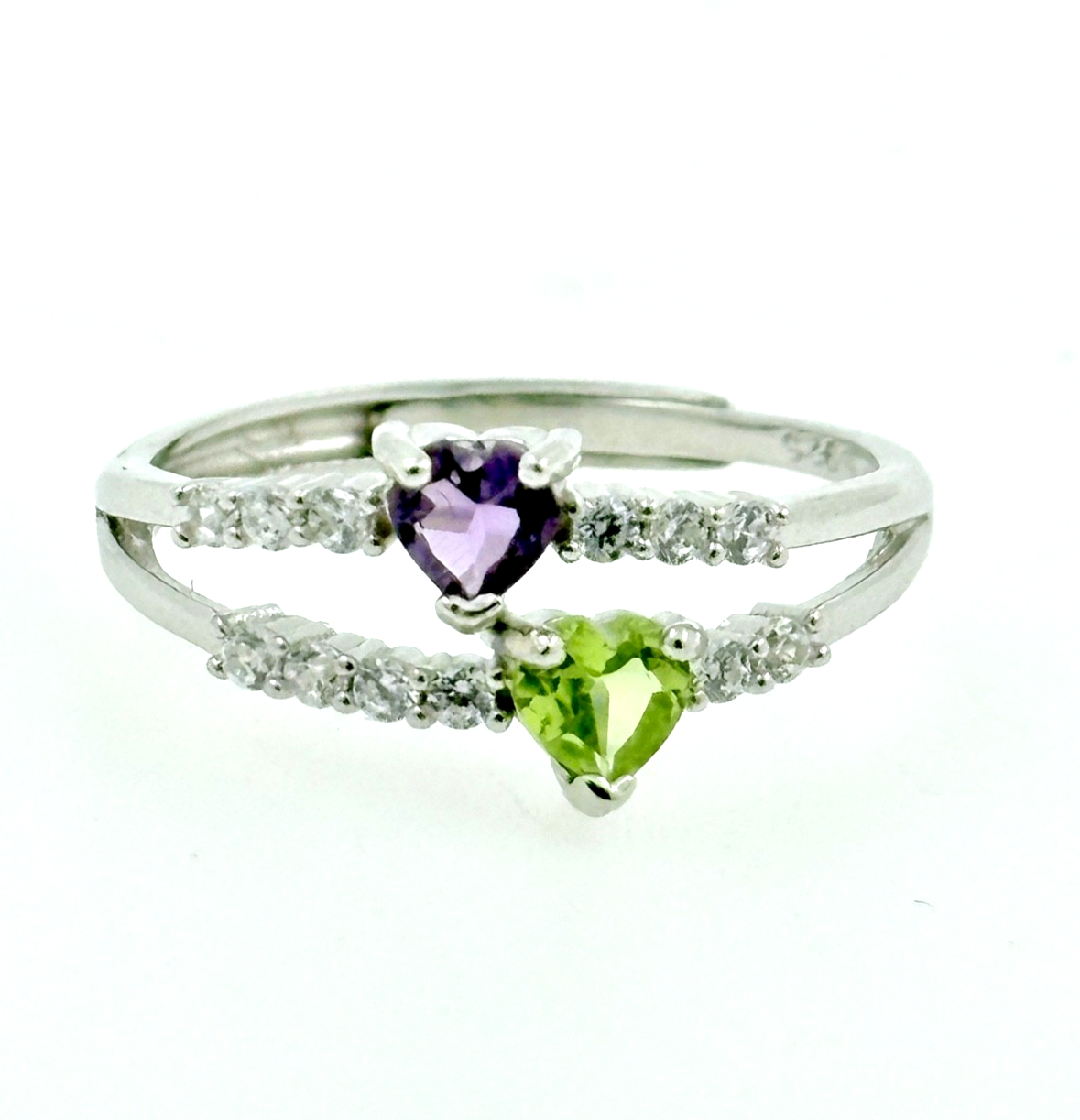This unique double band ring combines vibrant peridot (August birthstone) and regal amethyst (February birthstone) in solid 925 sterling silver (1.58g total weight).