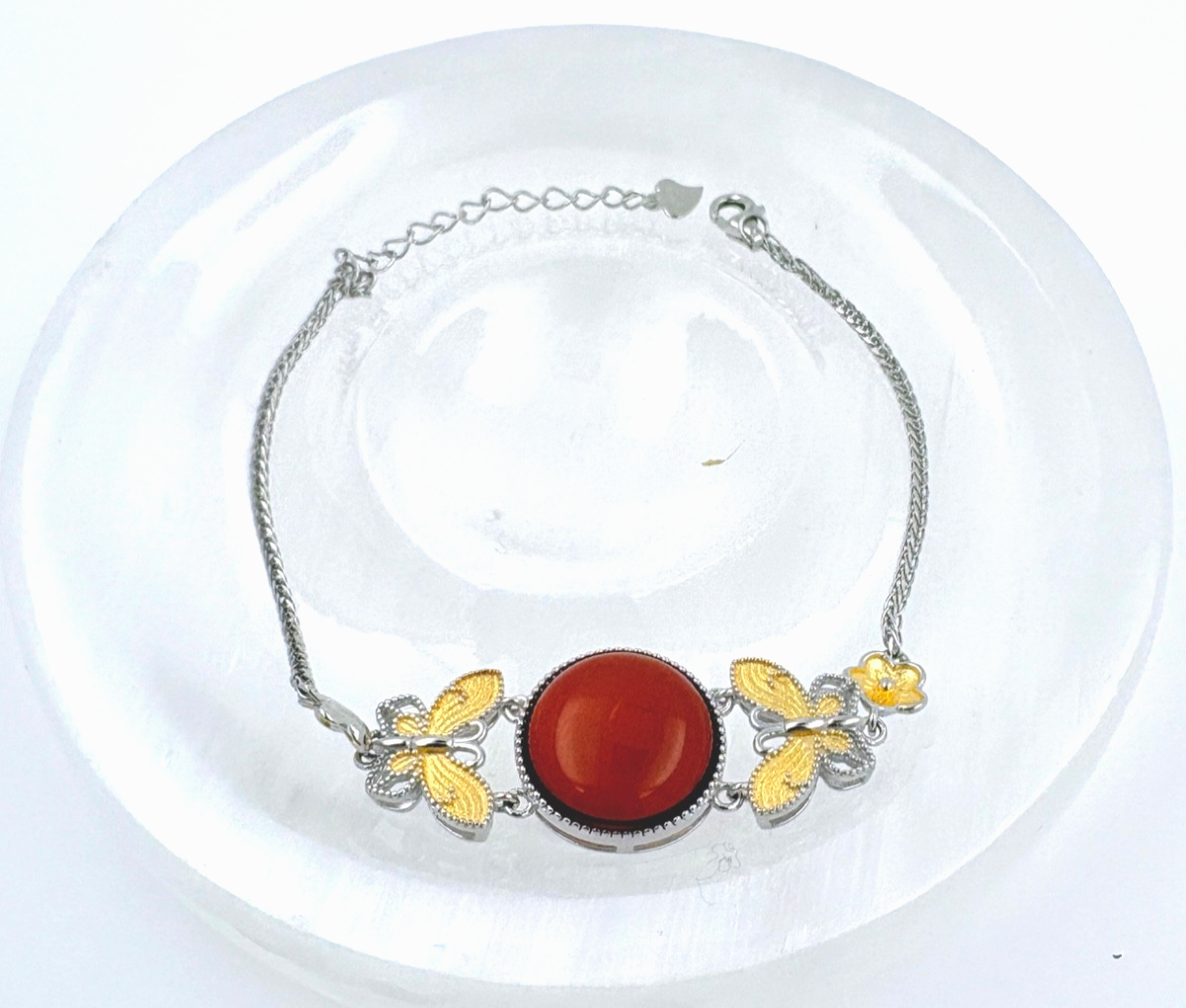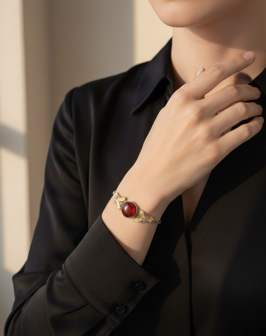 Add a touch of vibrant sophistication to your jewelry collection with our stunning Red Amber & Butterfly Bracelet. Crafted from high-quality 925 Sterling Silver, this piece features the warm, rich glow of red amber stones paired with delicate gold accents that bring the intricate butterfly charms to life.