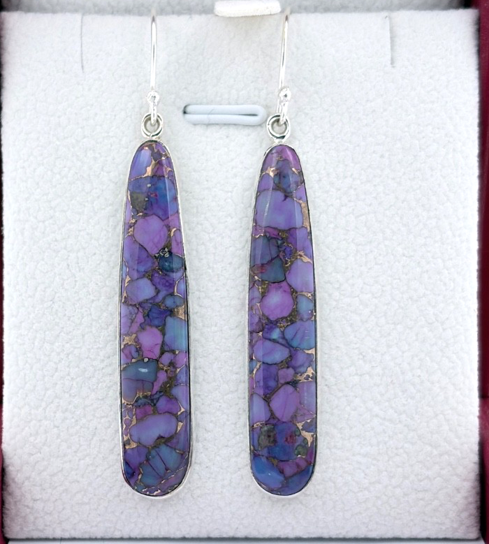 Make a statement with these breathtaking elongated drop earrings. Featuring genuine Kingman Purple Mojave Turquoise, these stones are celebrated for their vibrant violet hues infused with striking copper matrix veining. Each pair is a unique work of natural art, expertly set in high-polish Solid 925 Sterling Silver.