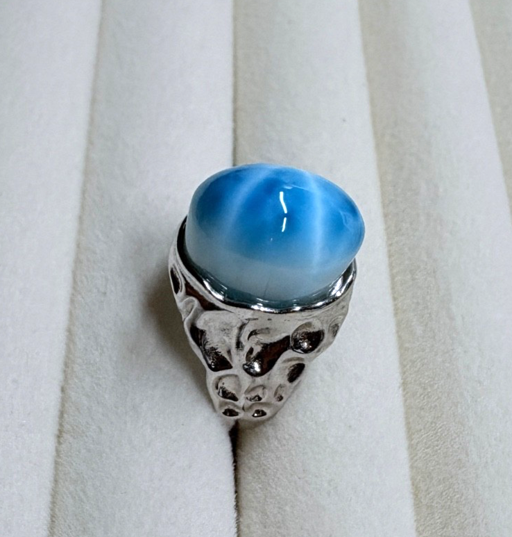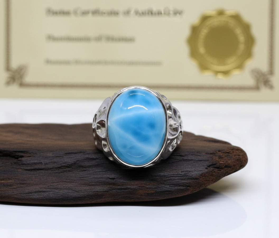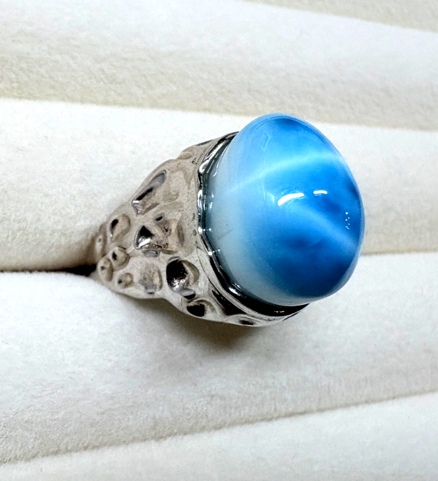 Ce superbe Bague Larimar-Cabochon est une pièce maîtresse qui capture l’essence de la mer des Caraïbes. Fabriqué en haute qualité Argent Sterling 925, il comporte une grande pierre ovale de Larimar connue pour ses teintes bleues volcaniques uniques et ses marbrures blanches.
