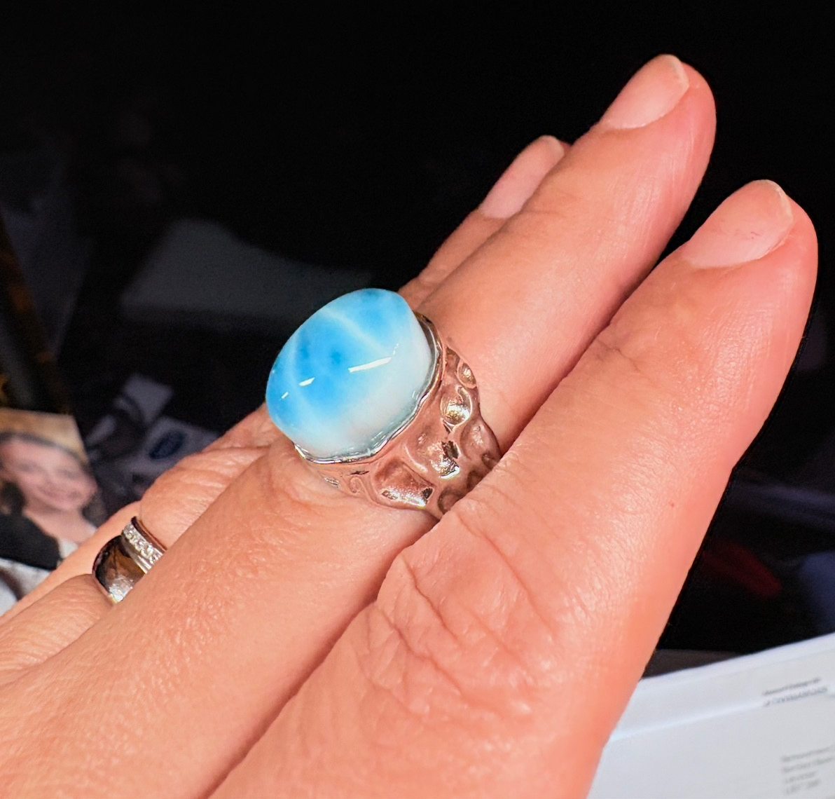 Ce superbe Bague Larimar-Cabochon est une pièce maîtresse qui capture l’essence de la mer des Caraïbes. Fabriqué en haute qualité Argent Sterling 925, il comporte une grande pierre ovale de Larimar connue pour ses teintes bleues volcaniques uniques et ses marbrures blanches. Modèle unique : Chaque pierre Larimar est unique en son genre ; les motifs de ce cabochon ressemblent à la lumière du soleil dansant sur les eaux peu profondes des Caraïbes. Cadre élégant : La monture argentée est conçue pour compléter la taille substantielle de la pierre tout en assurant un ajustement confortable. Authenticité garantie : La certification incluse garantit que la pierre précieuse est naturelle et que le métal est de l’argent 925 véritable. Noter: Le larimar est une pectolite rare que l’on trouve uniquem