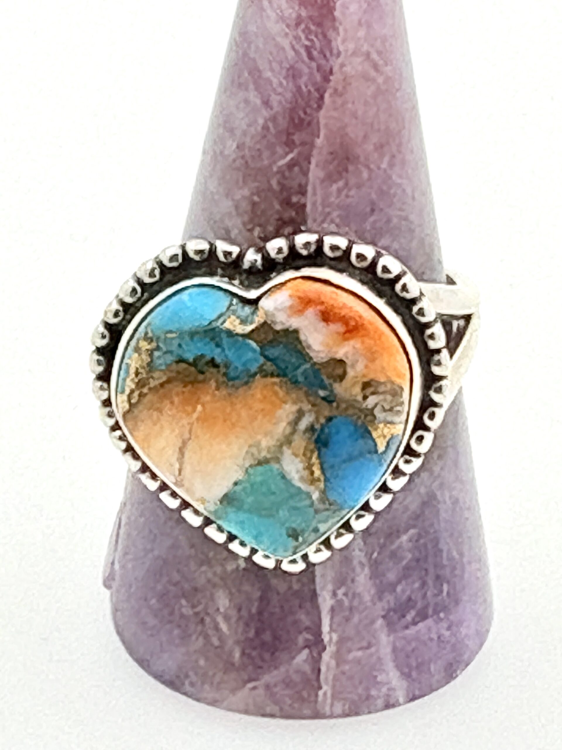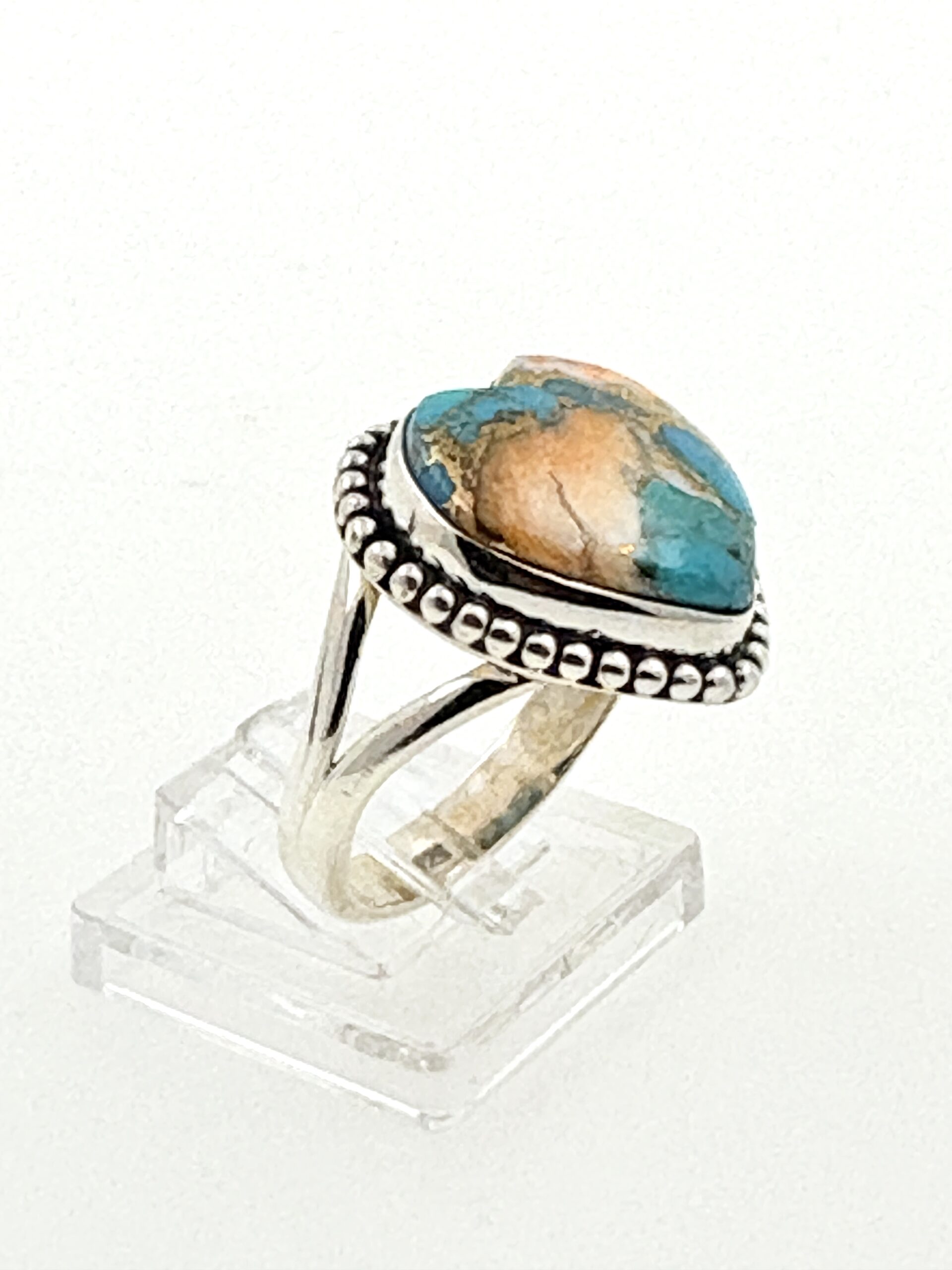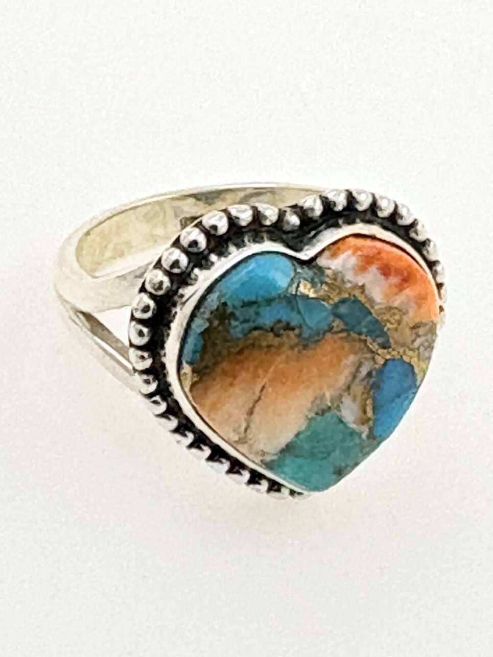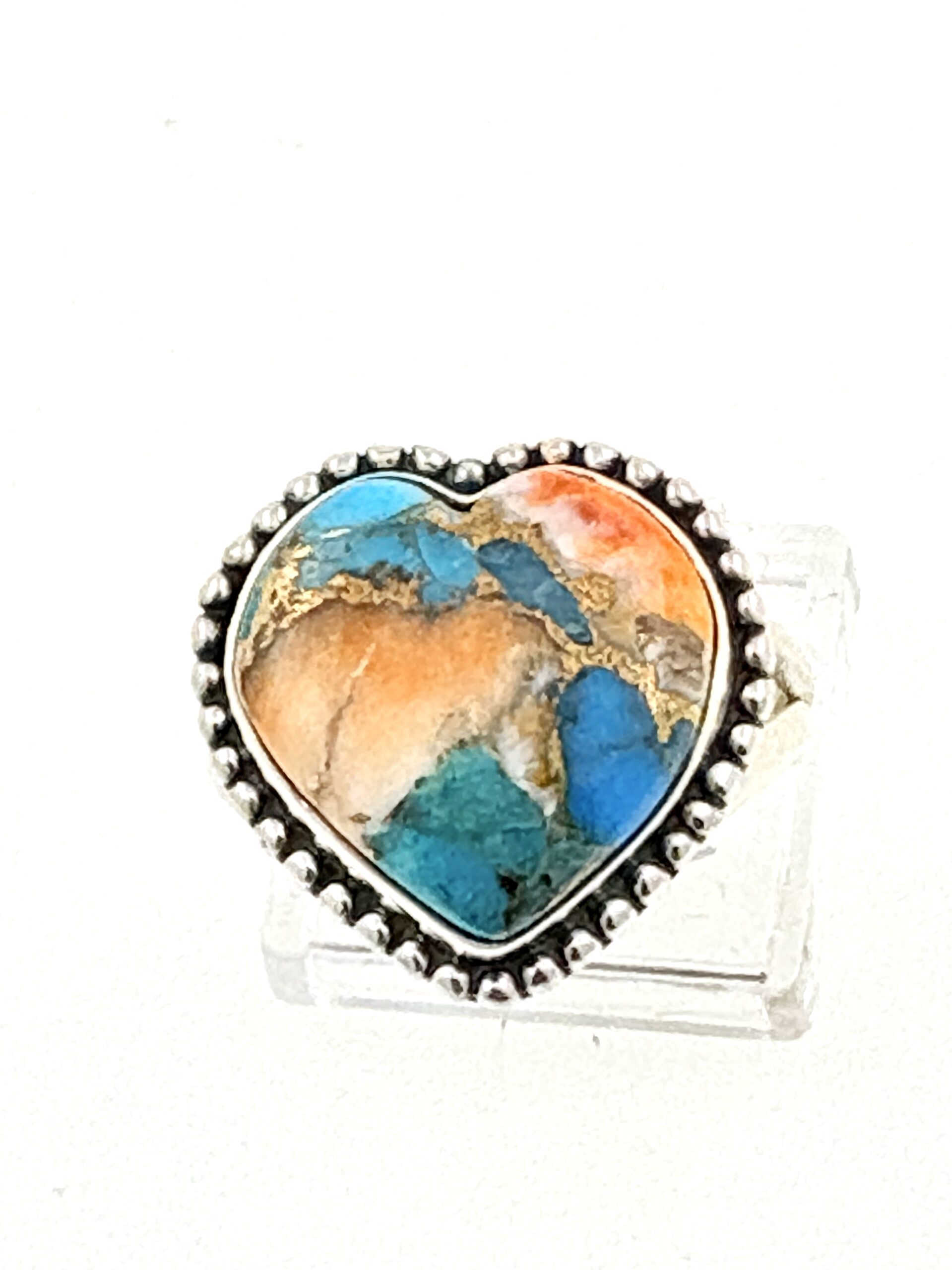 A bold and symbolic Heart ring featuring a genuine natural Mohave Turquoise, all crafted from solid 925 Sterling Silver.